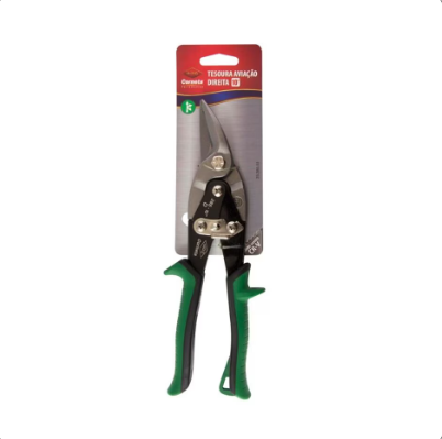 Tesoura para chapa com corte direito possui mecanismo de alavanca dupla, que permite alcançar máxima força de corte aplicando mínimo esforço. Possui entalhos especiais nas bordas das lâminas que impedem o deslizamento do material em processamento. Tem formato curvado para proporcionar melhor efetivação dos cortes curvos. Indicada para cortar chapa de metal.